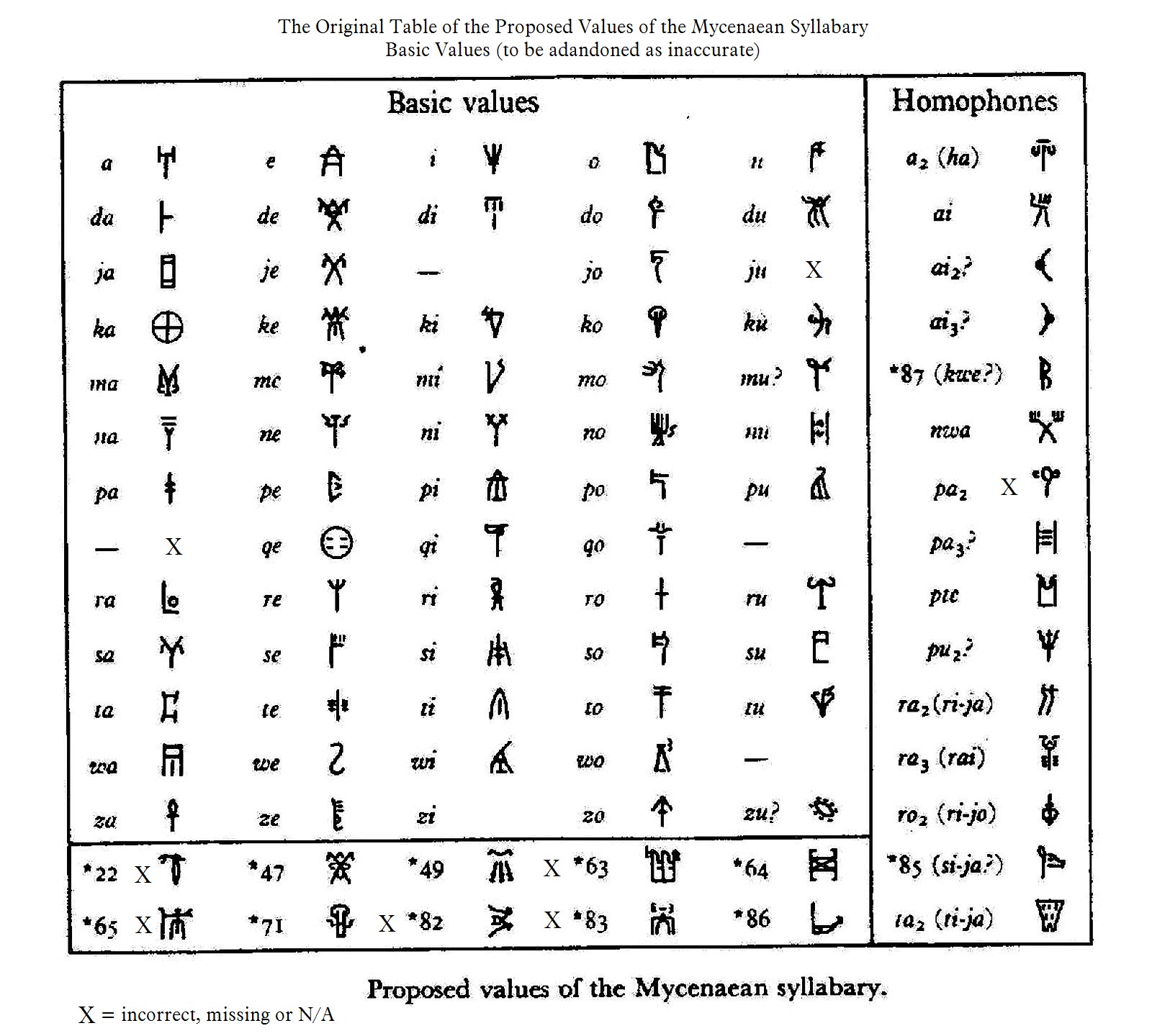 Completely Revised Mycenaean Linear B Basic Syllabograms, with 3 New Syllabograms JU (or YU), QA & ZU, Raising the Total from 58 to 61 with 1 less Homophone: Click to ENLARGE the Full Linear B Syllabary Revised 2014:NOTE! If you are using the standard chart of the Mycenaean syllabary currently available on the Internet, which looks like this: